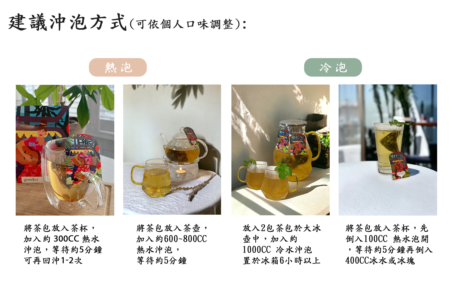 建議沖泡方式: 一包茶包,可加入約300~500cc 熱水沖泡,等待約5~10分鐘,可依個人口感調整
