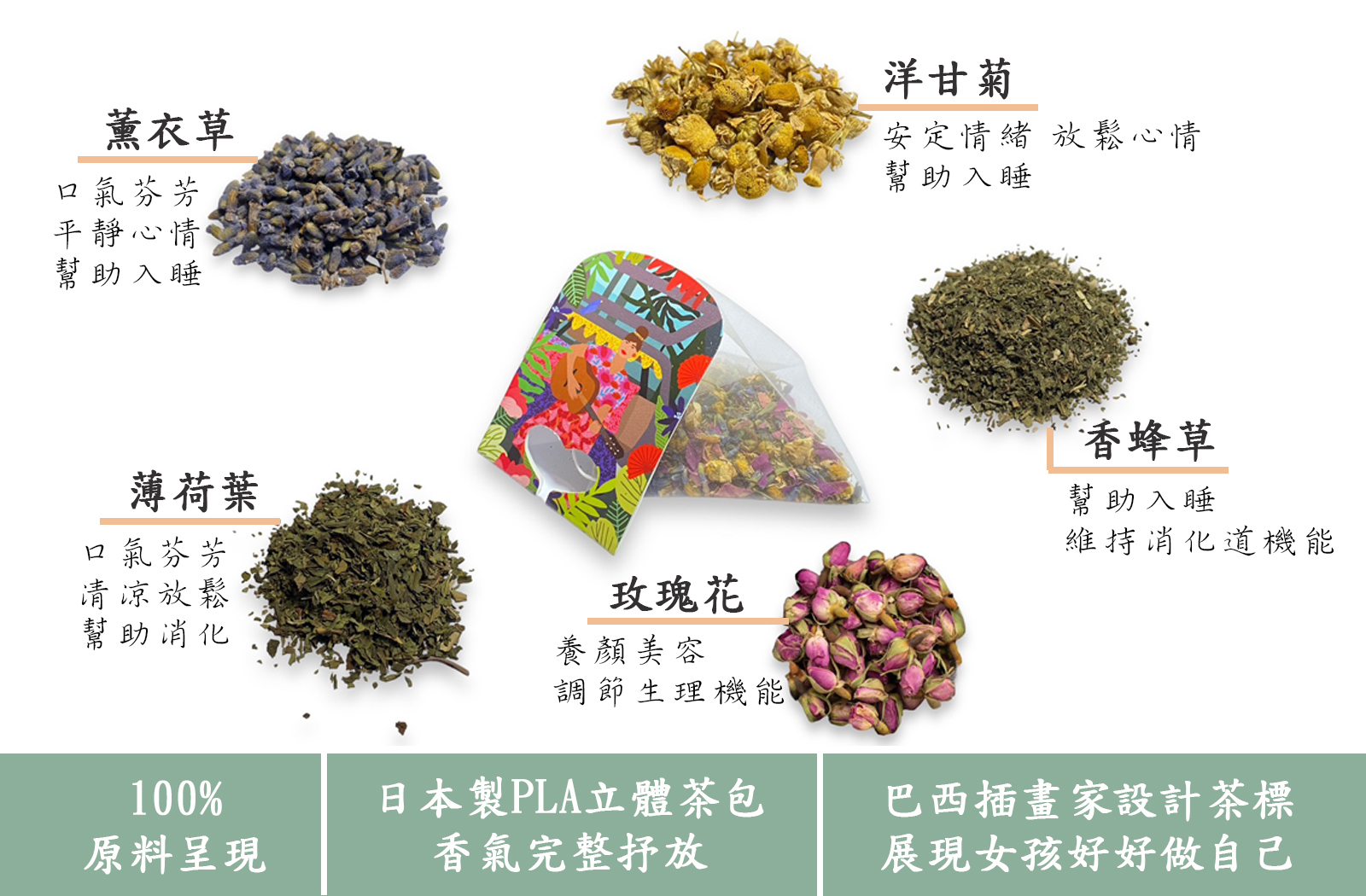 容物:香蜂草、洋甘菊 、薰衣草、玫瑰花 、薄荷